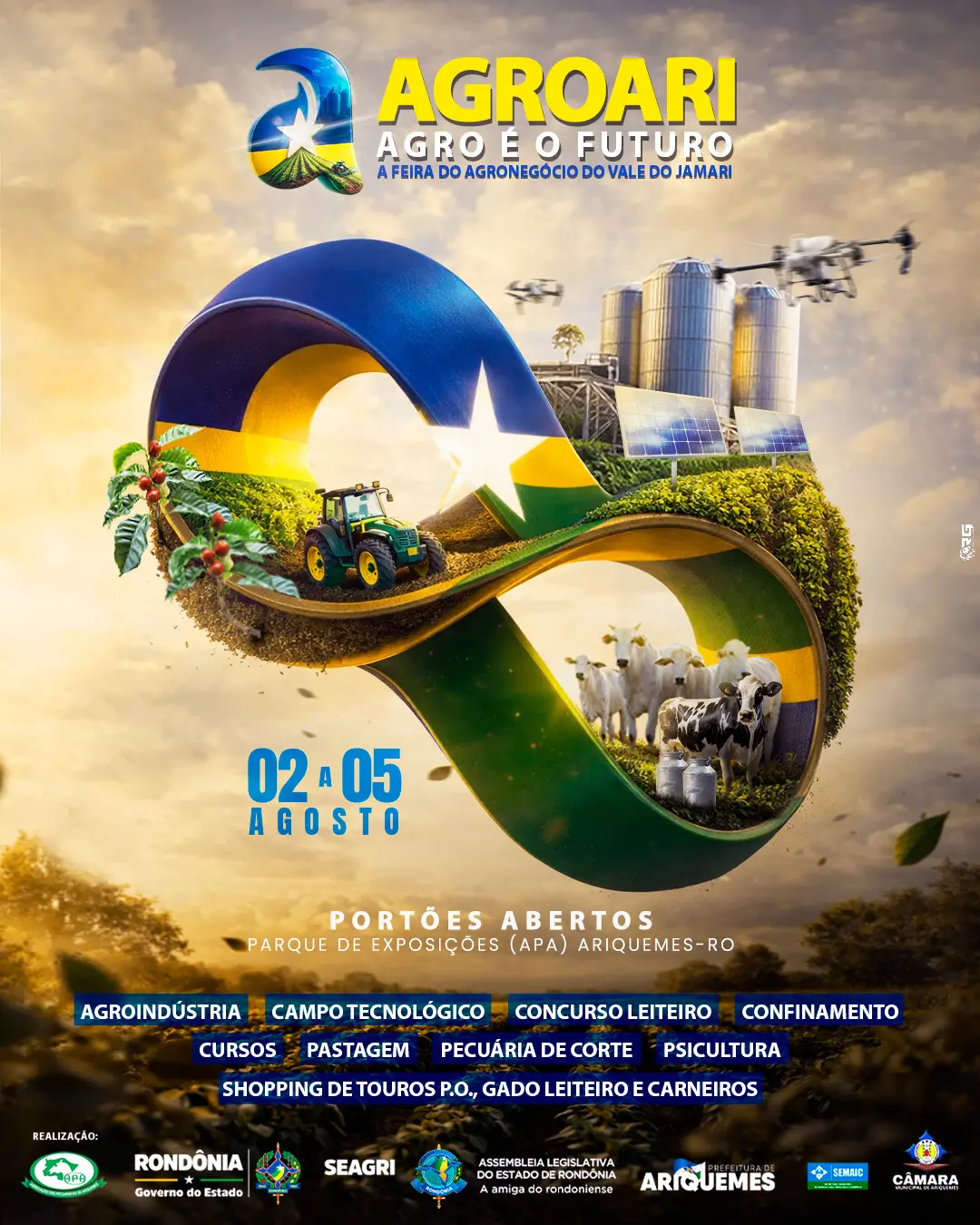 A Agroari, a Feira do Agronegócio de Ariquemes, será realizada de 27 a 30 de Julho de 2025, promovida pela Associação dos Pecuaristas pela de Ariquemes (APA), tendo o tema “Inovação e Pecuária intensiva”. Seu objetivo é fortalecer o agronegócio na região do Vale do Jamari e no Estado de Rondônia.